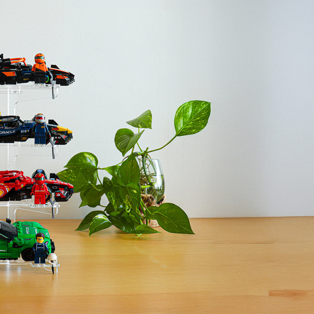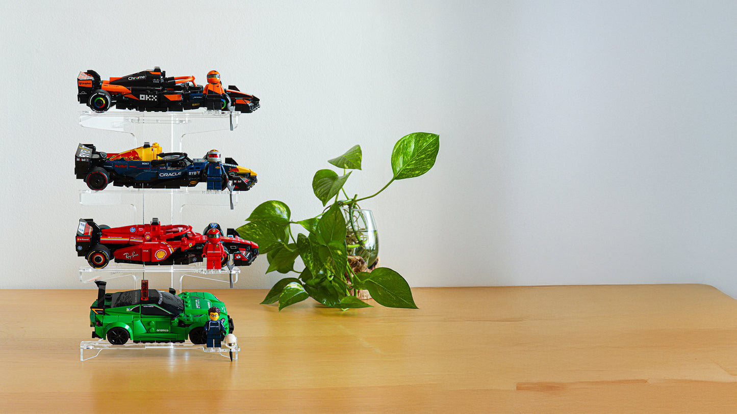 Compatible with all LEGO® Speed Champions cars, this stand offers a sleek and space-saving way to showcase your favourite 6-stud and 8-stud-wide cars.